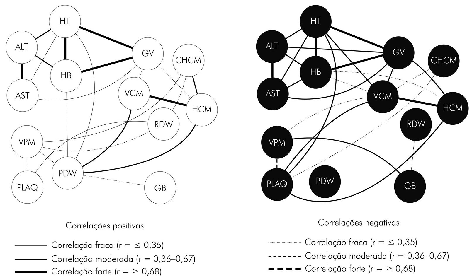 A elaboração das redes (networks) e demonstração das interações complexas entre os parâmetros avaliados foi realizada a partir da associação desses marcadores em cada grupo clínico. Foi realizado o teste de correlação de Spearman para avaliar a correlação significativa entre o valor absoluto e as concentrações dos componentes, com o auxílio do software estatístico. Com os dados gerados após a análise de correlação, foi realizada a construção das redes com o software Cytoscape v3.3.1 (Cytoscape Consortium San Diego, Califórnia, EUA). A forma e a espessura das linhas foram ajustadas para representar os tipos de correlações existentes (positivas ou negativas), além da intensidade dessas correlações.