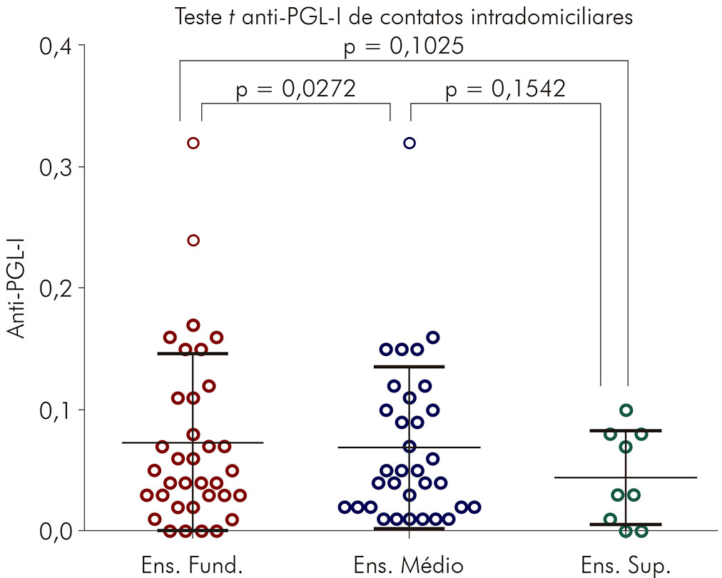 A análise da soropositividade anti-PGL-I, em relação à escolaridade, sugere que a baixa formação escolar tem como consequência menos informação e maior risco de contaminação por doenças, entre elas a hanseníase. A análise de níveis de soropositividade entre contatos e não contatos de portadores de hanseníase e escolares da população geral de um município do oeste do Pará, onde a endemicidade é alta e a escolaridade é baixa, encontrou percentuais de soropositividade elevados em todos os grupos. A positividade encontrada nos escolares levanta indícios de que existe uma elevada prevalência de infecção subclínica pelo M. leprae entre eles, e de que a origem do contato estaria em caso índice não identificado no domicílio dos escolares26.