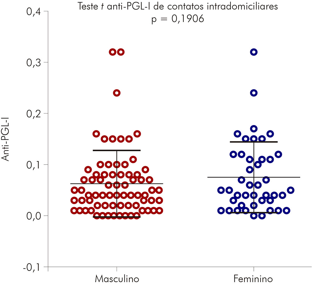 Os dados foram armazenados em banco de dados elaborado no programa Microsoft Excel® 2007, e as análises foram realizadas no programa BioEstat v5.313, considerando-se o intervalo de confiança de 95% e nível α de 5% (p ≤ 0,05). Foram realizadas medidas de tendência central, teste t de Student para comparação entre variáveis e correlação linear de Pearson para avaliar a relação entre idade e titulação de anti-PGL-I.