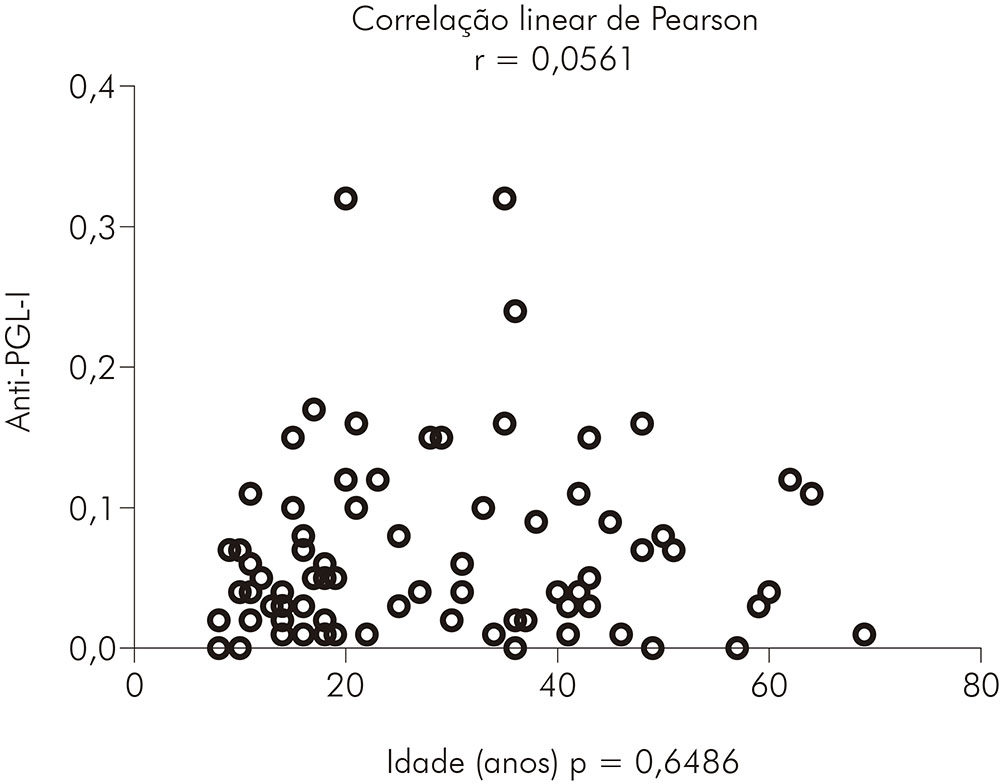 A correlação não demonstrou tendência significativa do aumento dos níveis de PGL-I com a diminuição ou aumento da idade (r = 0,0561), embora as maiores titulações tenham sido observadas nas faixas etárias abaixo dos 40 anos (Figura 4).