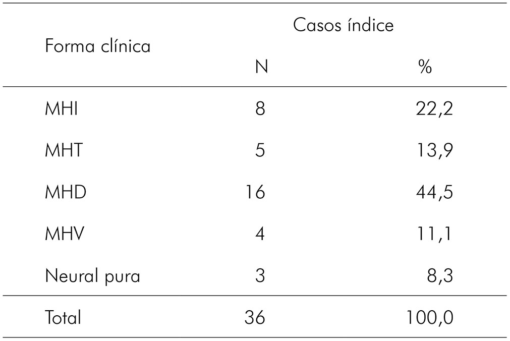 Entre os casos índices que fizeram parte do estudo, observou-se que a forma clínica mais diagnosticada, segundo a classificação de Madri, foi a MHD, com 44,5% (16/36), seguida de MHI e MHT, com 22,2% e 13,9%, respectivamente (Tabela 1).
