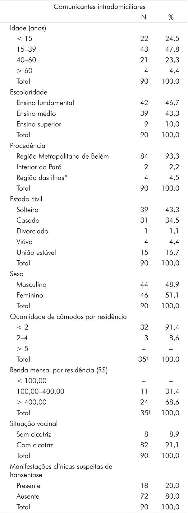 O perfil sociodemográfico dos comunicantes identificou que 47,8% (43/90) pertenciam à faixa etária de 15 a 39 anos, seguida por uma faixa de menores de 15 anos, com percentual de 24,5% (22/90). A maioria possuía ensino fundamental (46,7%; 42/90), era oriunda da Região Metropolitana de Belém (93,3%; 84/90), tinha estado civil "solteiro" (43,3%; 39/90), pertencia ao sexo feminino (51,1%; 46/90) e possuía renda per capita superior a R$ 400,00 (68,6%; 24/35). Em relação ao número de cômodos da moradia, a maioria dos indivíduos (91,4%; 32/35) disse habitar casas com menos de dois cômodos (Tabela 2).