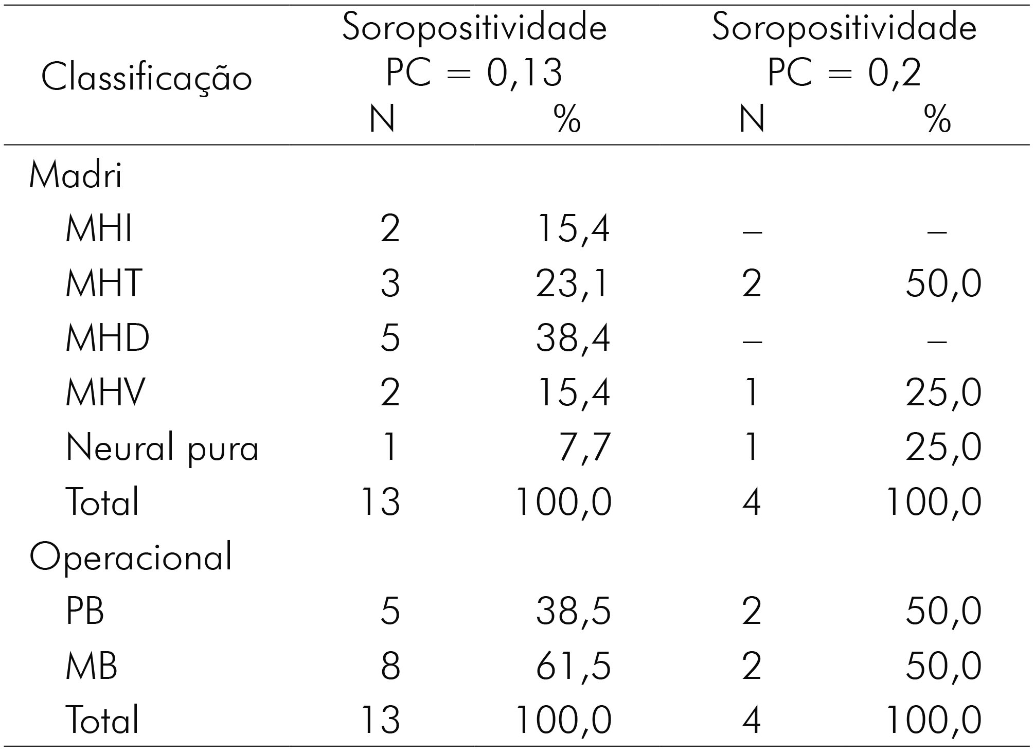 Quanto à soropositividade do teste ELISA entre os comunicantes, utilizando-se PC de 0,13 e 0,2, e sua relação com a forma clínica dos casos índices, 13 comunicantes foram positivos, com PC = 0,13, segundo a classificação de Madri, sendo que 38,4% tinham como caso índice portadores de hanseníase MB (MHD). Houve quatro indivíduos positivos para PC = 0,2, segundo a classificação operacional, sendo dois com caso índice PB (50,0%) e dois com caso índice MB (50,0%) (Tabela 3).