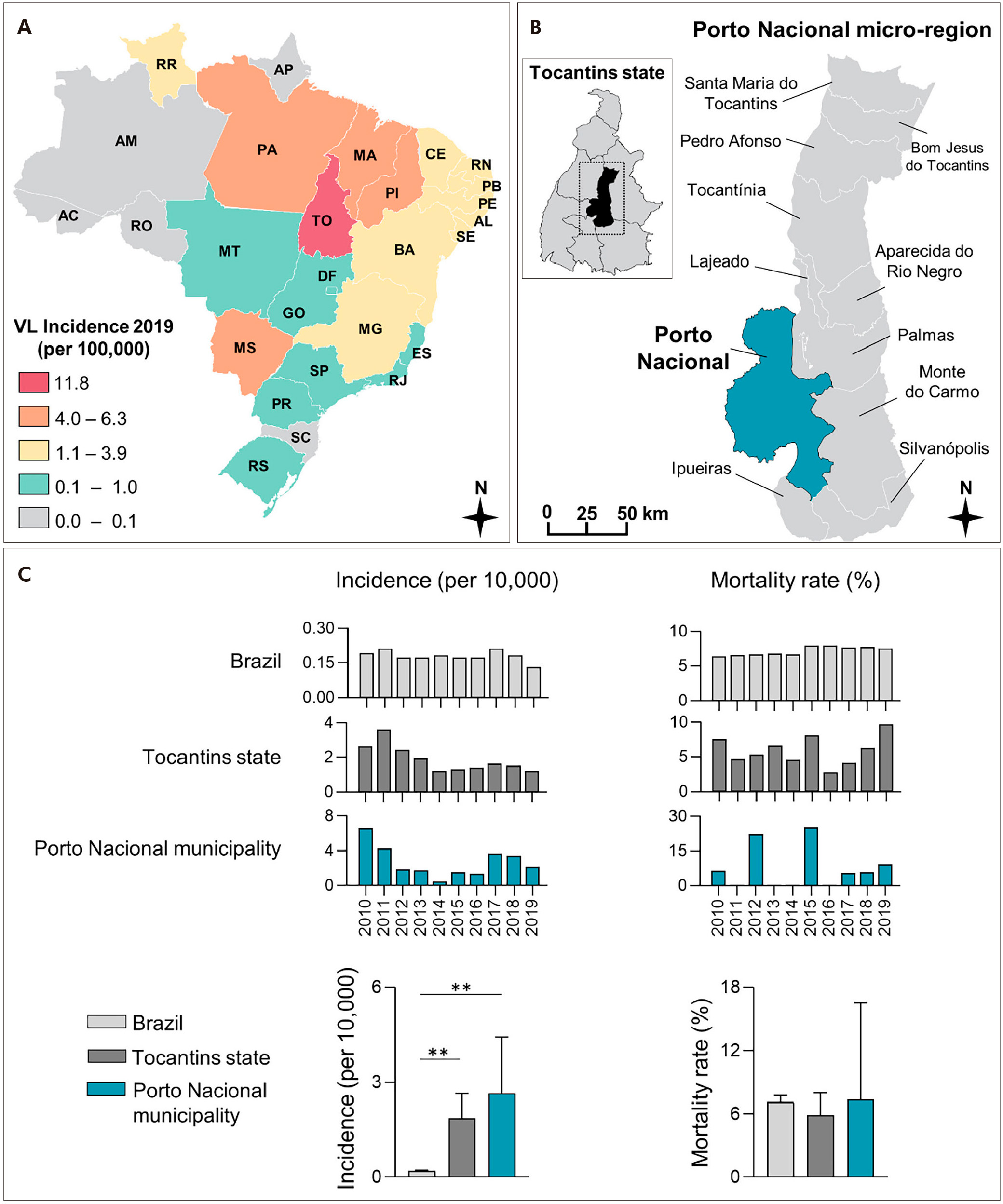 A: HVL incidence across Brazilian states; B: Porto Nacional micro-region map showing the 11 municipalities, with Porto Nacional municipality highlighted in blue; C: Comparison of HVL incidence (per 10,000 inhabitants) and mortality rate in Brazil, Tocantins State, and Porto Nacional municipality. (Wilcoxon test: W = p = 0.0020).