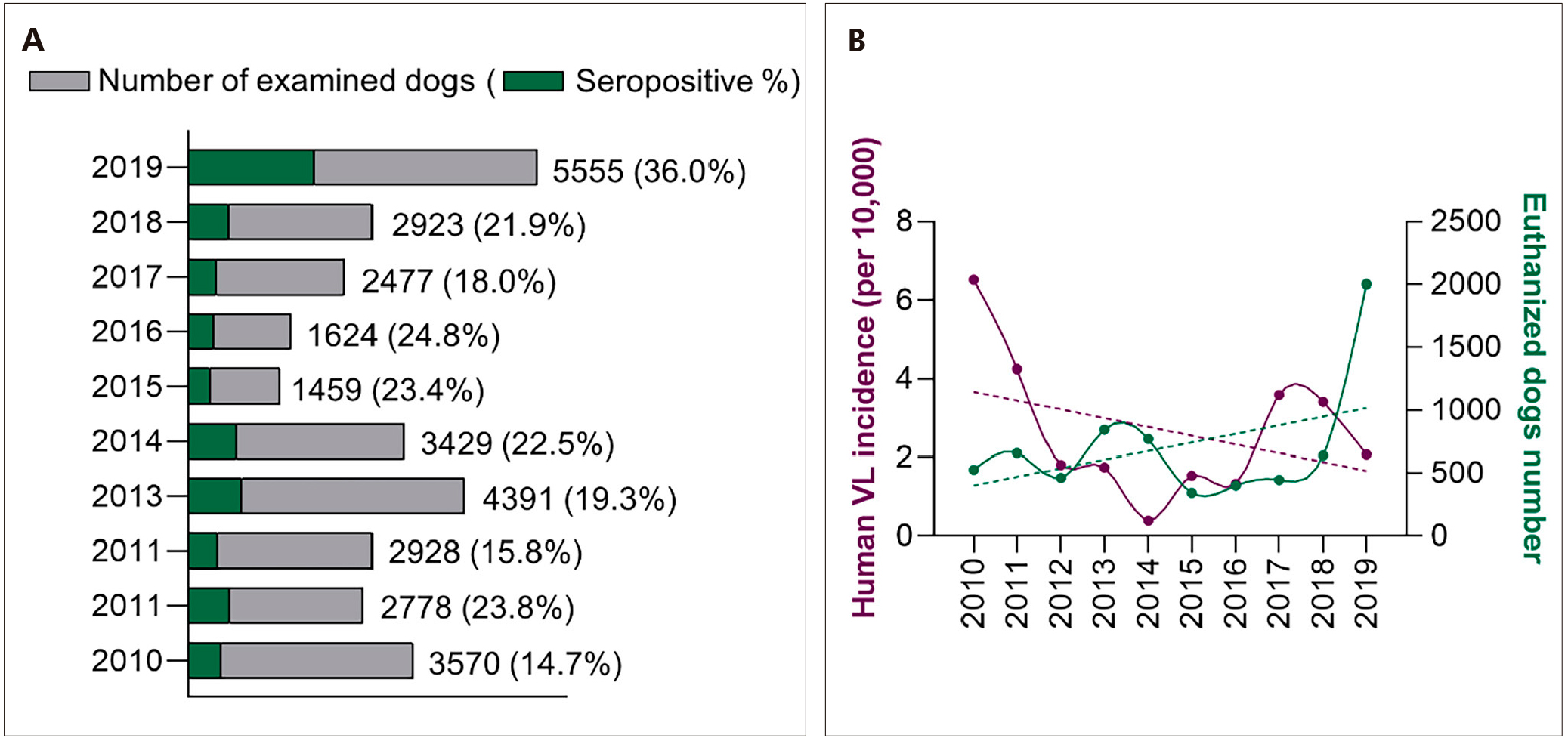 A: Number of examined dogs and percentage of seropositivity in Porto Nacional, from 2010 to 2019; B: Epidemiological indicators of canine euthanasia and HVL incidence from 2010 to 2019 (Spearman correlation test, r = 0.8113).