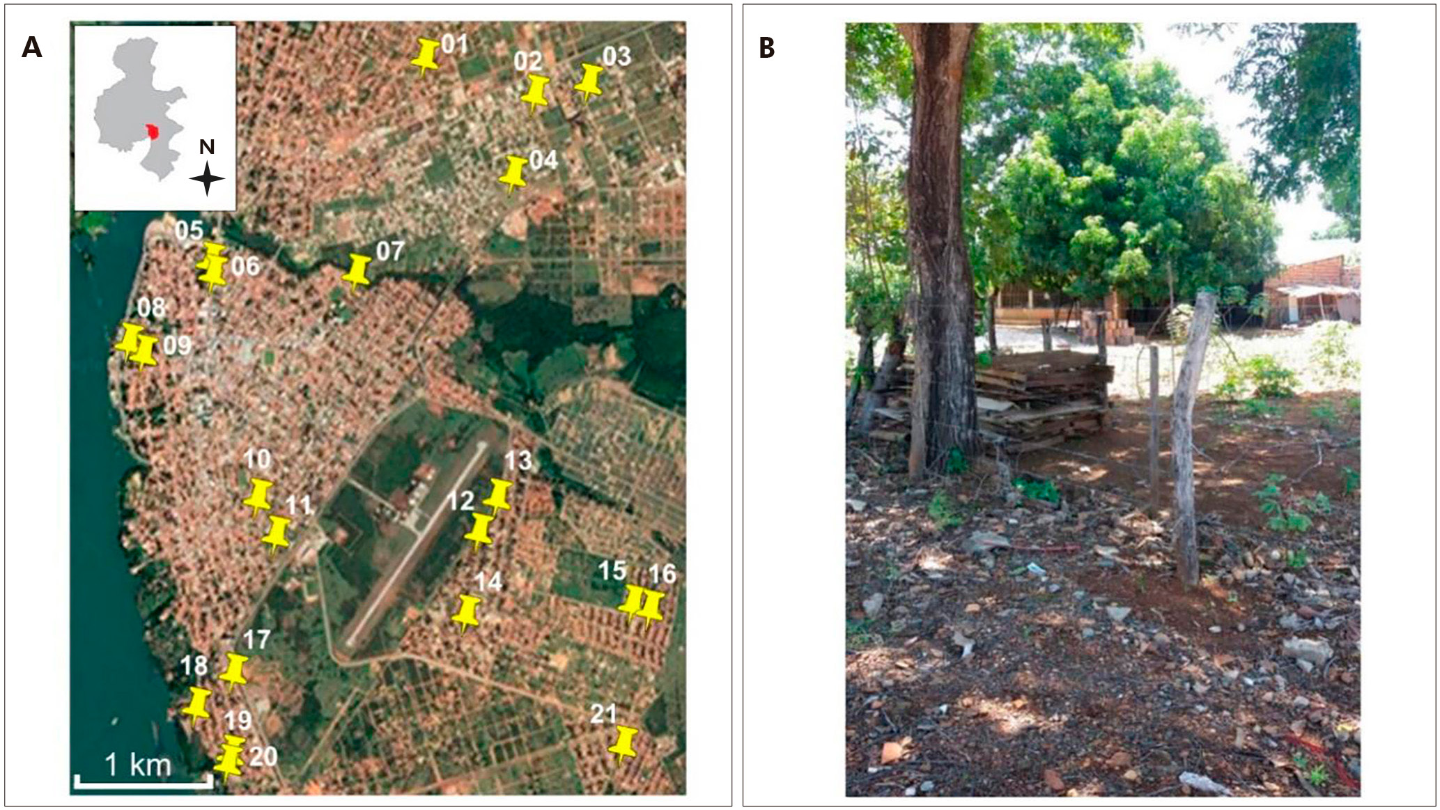 A: Map indicating collection points in the urban area of Porto Nacional; B: Example of a collection site, showing an urban residential backyard with rubble.