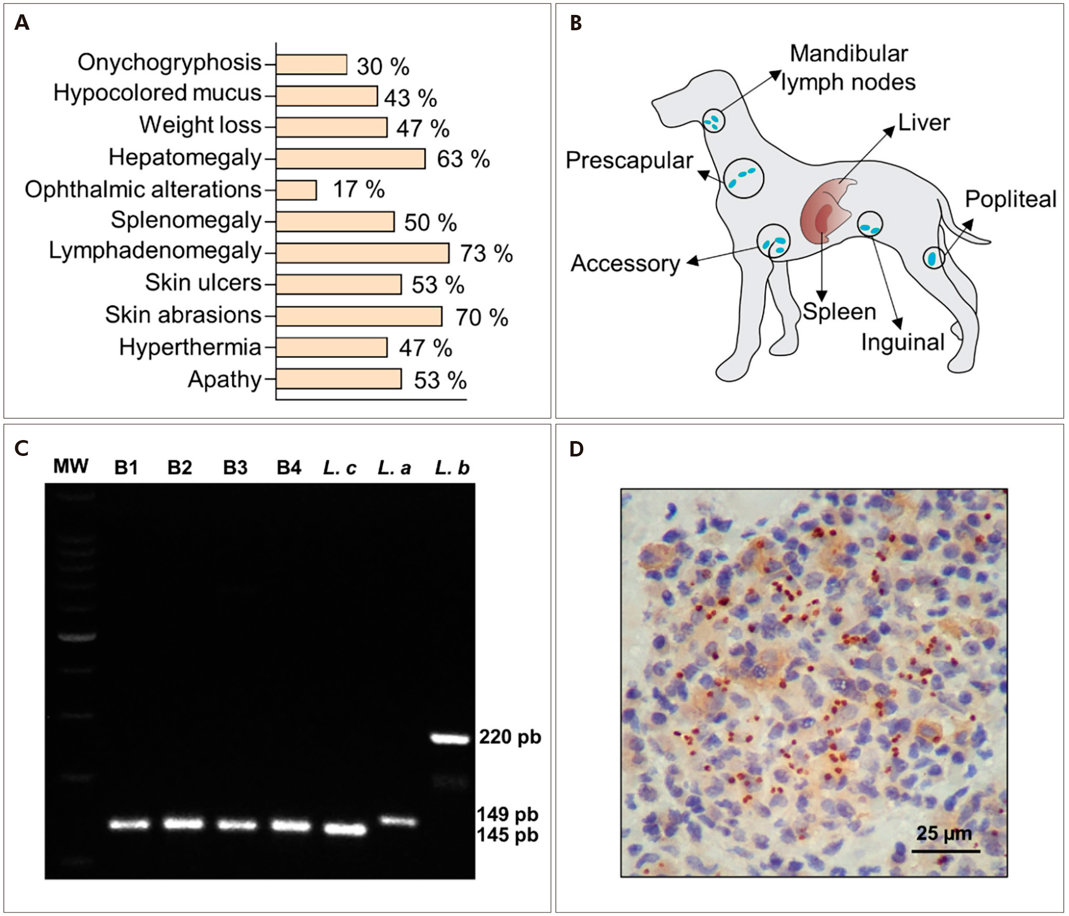 A: Clinical signs observed in dogs presenting CVL; B: Tissues collected post-euthanasia (spleen, liver, and lymph nodes) for Leishmania spp. detection; C: PCR results of four samples (B1 to B4), showing the molecular weight (MW, GeneRuler 100 bp DNA Ladder) on the left and positive controls for the different species on the right; D: IHC detection of stained amastigotes in a spleen section (bar size indicated in µm).