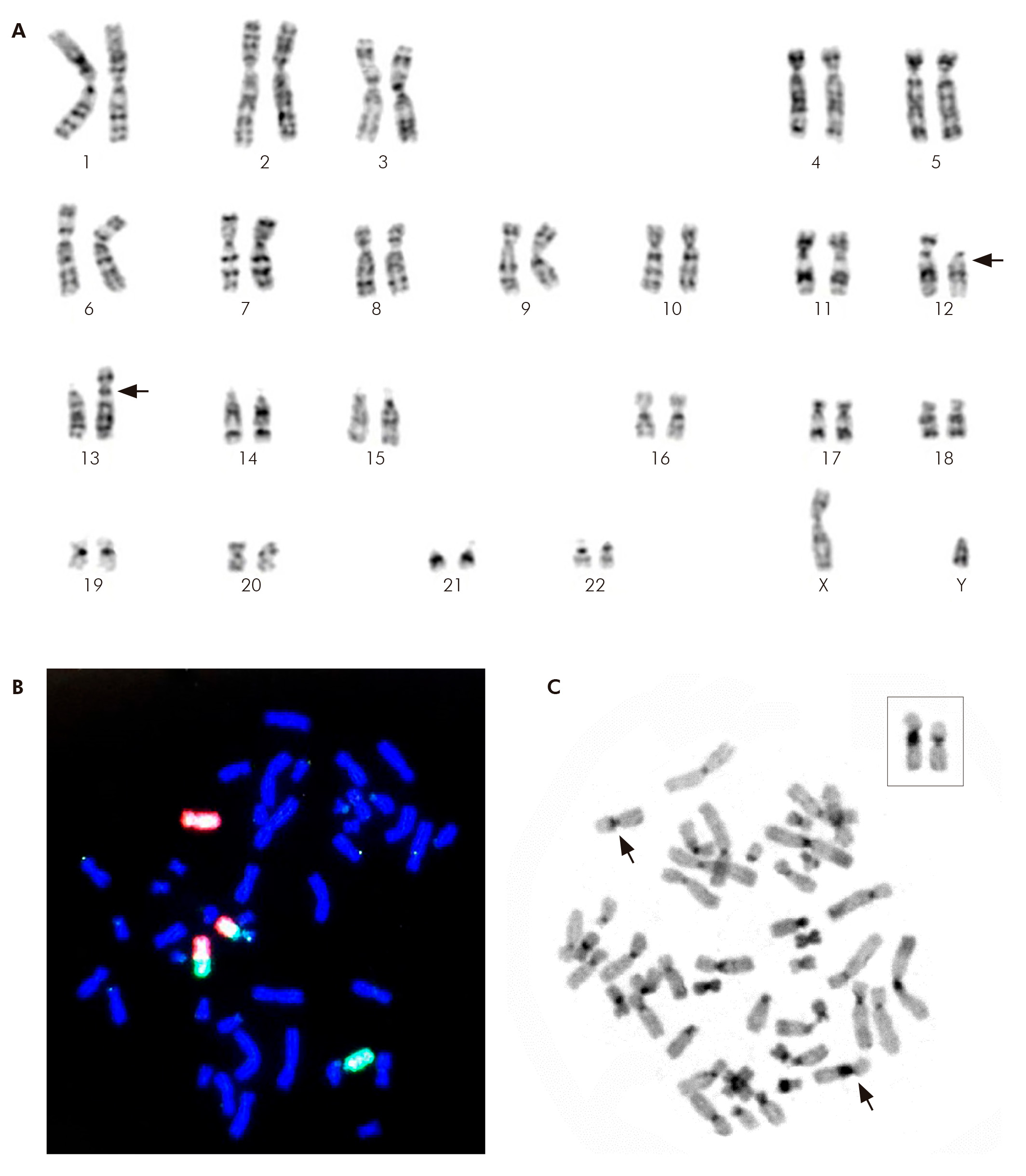A: Cariótipo com bandeamento G mostrando 46, XY, t(12;13)(q13;q12), as setas indicam os cromossomos envolvidos na translocação; B: Pintura do cromossomo inteiro (FISH) mostrando translocação envolvendo o braço curto do cromossomo 12 com o braço longo do cromossomo 13, identificando o ponto de quebra t(12;13)(q13;q12) cromossomos 12 (FITC, verde) e 13 (CY3, vermelho); C: Metáfase com a técnica de bandeamento C, as setas indicando par cromossômico 9.