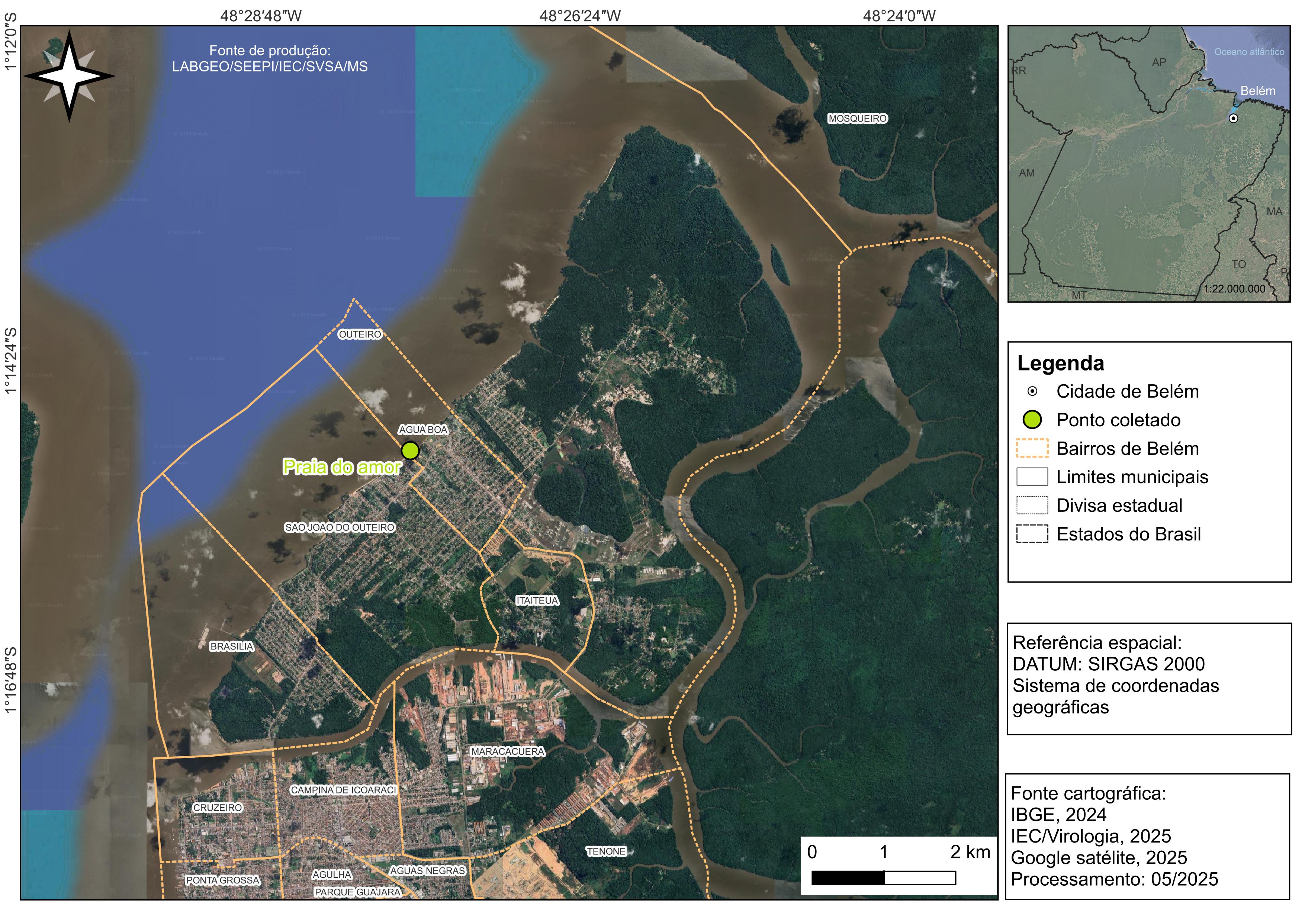 Figura 1 - Mapa da região da Praia do Amor, com indicação do ponto de coleta de água na Ilha de Caratateua, Belém, estado do Pará