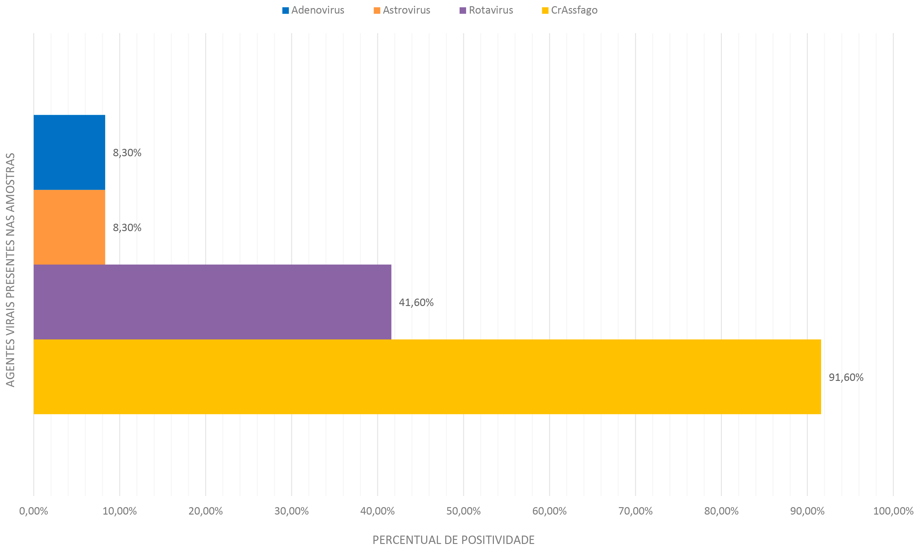 A detecção de rotavírus (RV), enterovírus (EV), adenovírus (AdV), astrovírus (AstV), sapovírus (SaV), parechovírus (HPeV), aichivírus (AiV), cosavírus (HCosV) e CrAssfago foi realizada por reação em cadeia da polimerase quantitativa (qPCR) ou reação em cadeia da polimerase quantitativa com transcrição reversa (RT-qPCR), utilizando o kit GoTaq® Probe 1-Step RT-qPCR System (Promega, EUA). O ensaio para AstV foi conduzido na plataforma CFX96™ Real-Time System (Bio-Rad®), enquanto os demais foram processados na plataforma QuantStudio™ 5 (Applied Biosystems®).