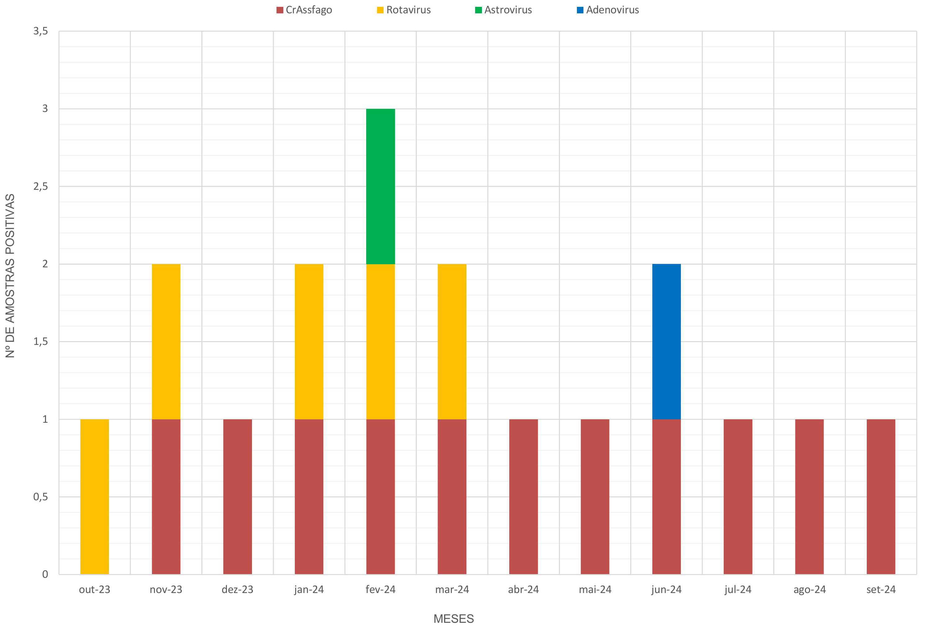 Foram realizadas coletas mensais entre outubro de 2023 e setembro de 2024. A detecção viral foi conduzida por reação em cadeia da polimerase (PCR), e a caracterização metagenômica, por sequenciamento de nova geração.