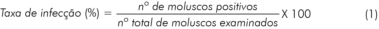 As cercárias observadas foram classificadas em morfotipos, considerando características como padrão de nado, forma corporal e presença de estruturas específicas36. A partir do total de moluscos analisados e registrados na planilha, calculou-se a taxa de infecção natural por S. mansoni, utilizando a equação 1, conforme diretriz técnica do Ministério da Saúde6: