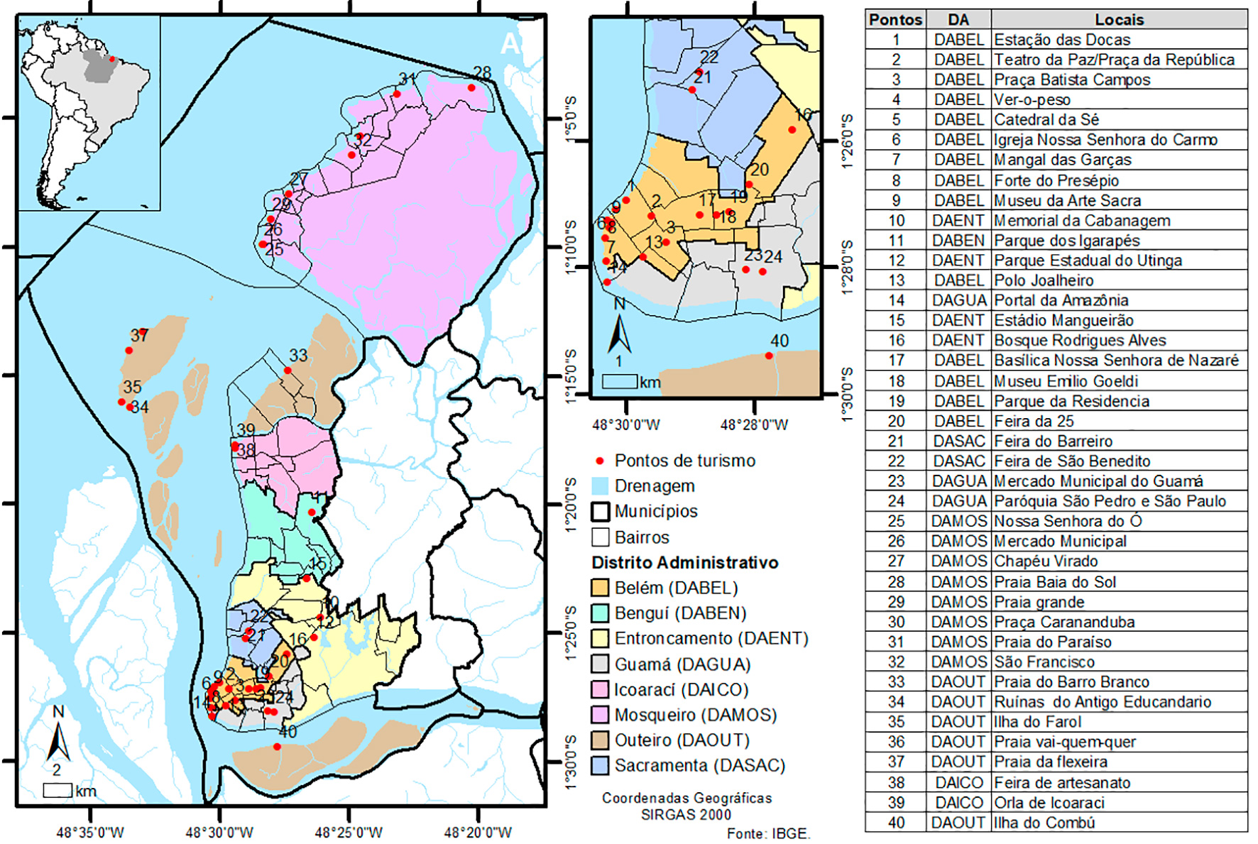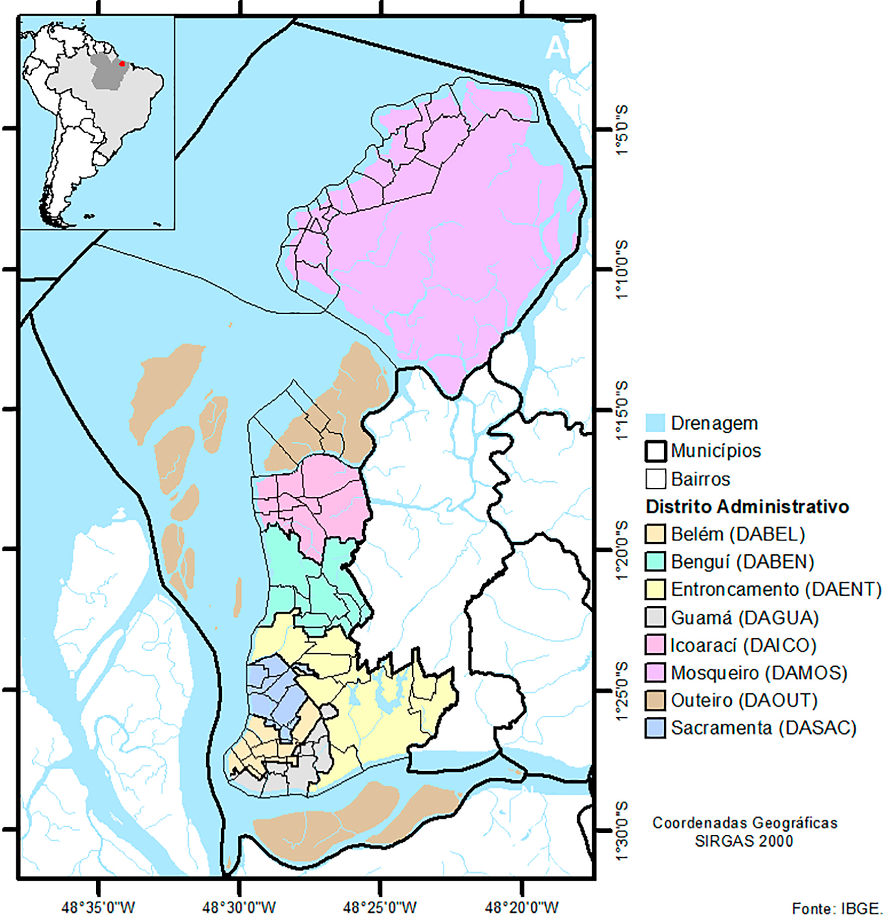 Belém é subdividida em oito distritos administrativos: Belém (DABEL), Benguí (DABEN), Entroncamento (DAENT), Guamá (DAGUA), Icoaraci (DAICO), Mosqueiro (DAMOS), Outeiro (DAOUT) e Sacramenta (DASAC) (Figura 1).