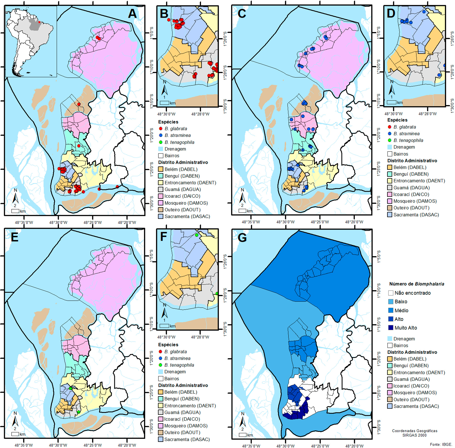 Figura 2 - Distribuição espacial das espécies de Biomphalaria nos distritos administrativos de Belém