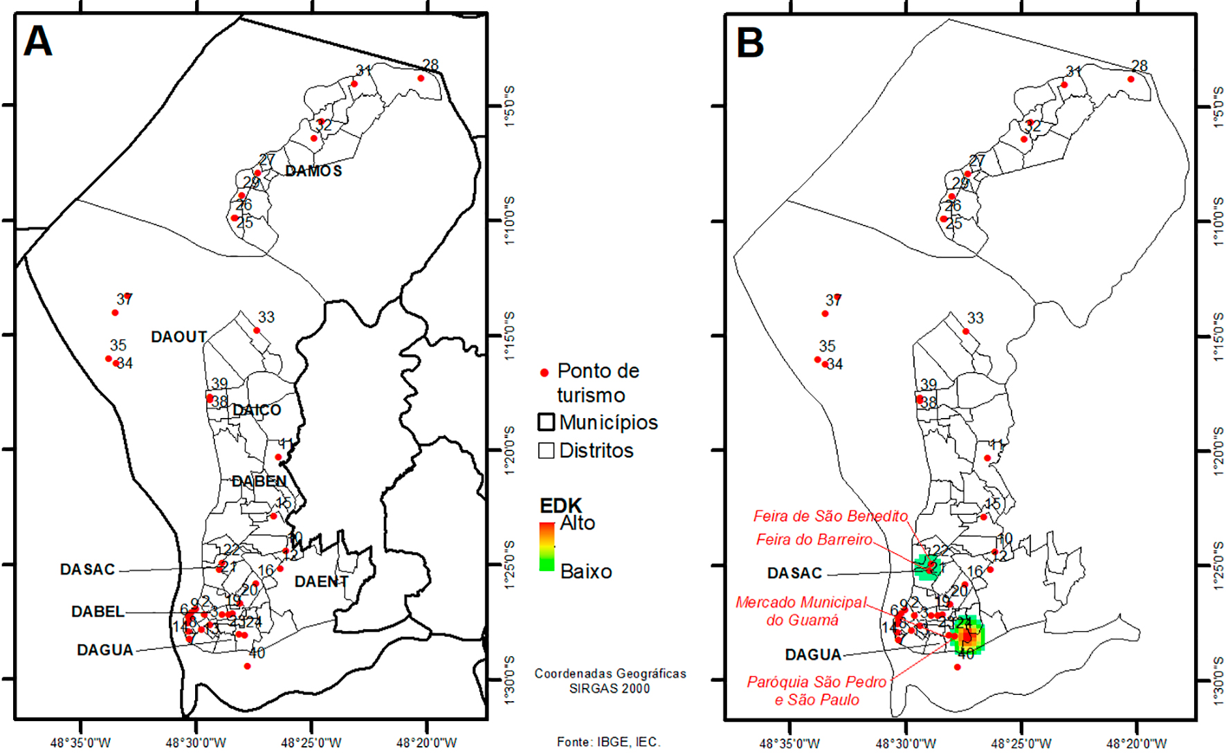 A: distribuição espacial dos pontos turísticos por distrito administrativo; B: estimativa de densidade Kernel (EDK) evidenciando as áreas de maior vulnerabilidade para transmissão de S. mansoni, considerando aglomerações de moluscos positivos sobrepostas à localização dos pontos turísticos.