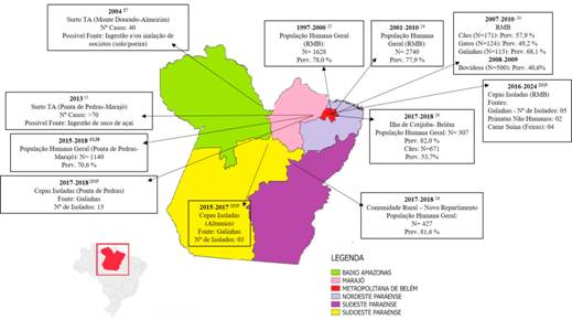 Figura 1 - Mapa-resumo dos principais resultados de investigações epidemiológicas, surtos e ensaios biológicos conduzidos pelo LABTOXO/IEC no estado do Pará, Brasil, entre 1997 e 2025